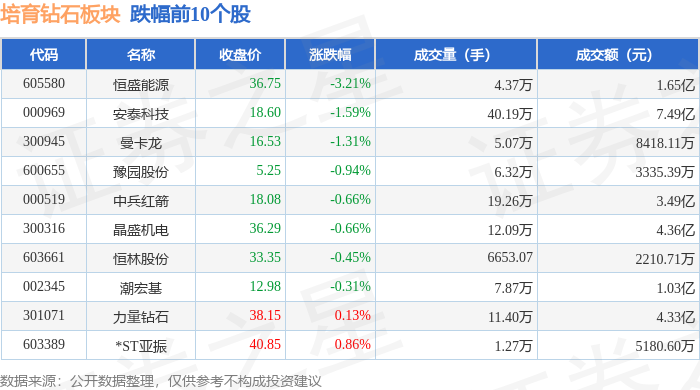 证券之星消息,12月9日培育钻石板块较上一交易日上涨0.04%,沃尔德领涨。当日上证指数报收于3909.52,下跌0.37%。深证成指报收于13277.36,下跌0.39%。培育钻石板块个股涨跌见下表: