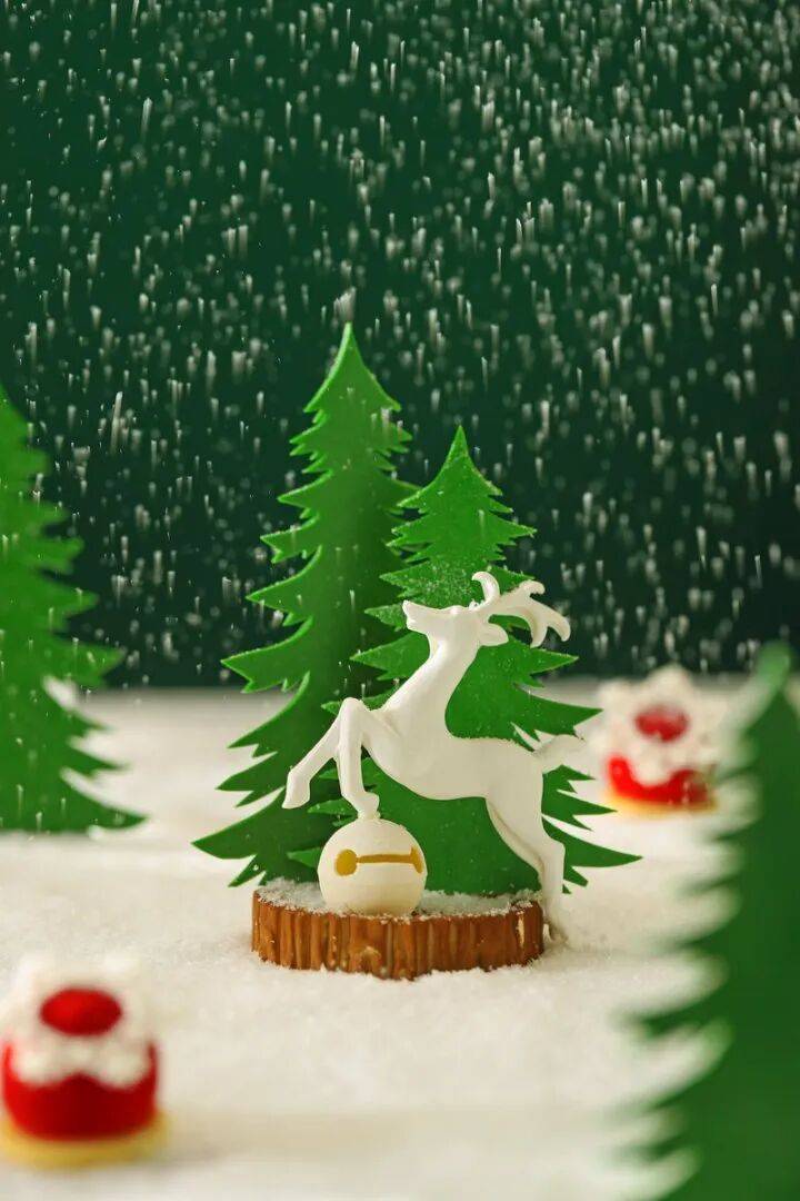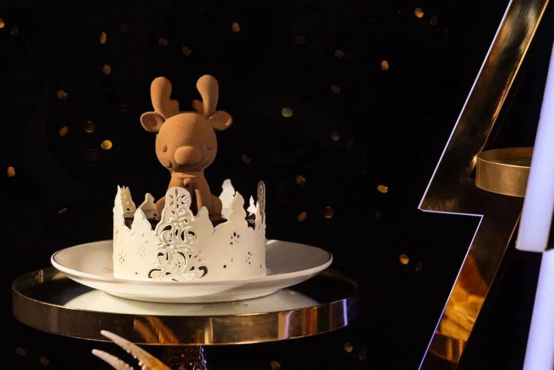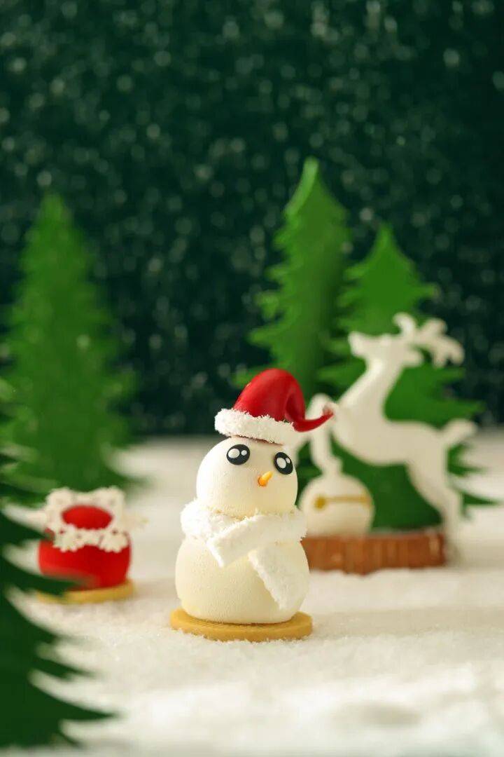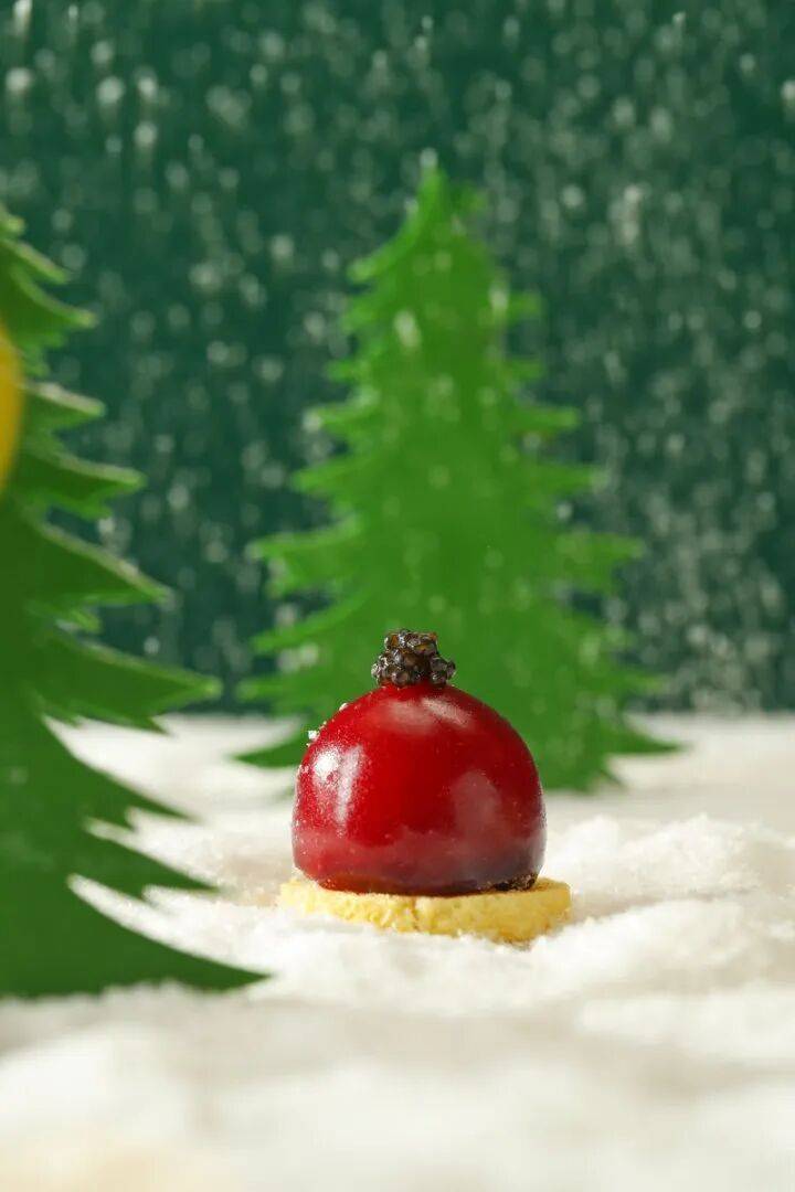 甜点部分更是视觉与味觉的双重盛宴。小雪人造型讨巧,栗子香草奶油的绵密口感在口中融化,寓意着节日的美好祝愿;树莓苹果芝士蛋糕以圣诞帽造型呈现,色泽靓丽。