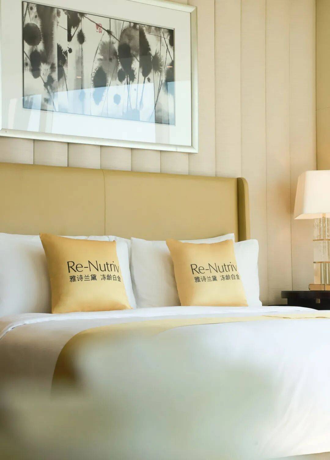 沁妍雅韵铺陈空间叙事,于全景落地窗前沉浸体验城市奢韵絮语,每一缕光影皆成为空间的温润注脚。雅诗兰黛冻龄白金主题元素悄然融入居停细节,焕发生机韵律,灵动光影与精致格调共生,于静谧中奢享放松时刻。