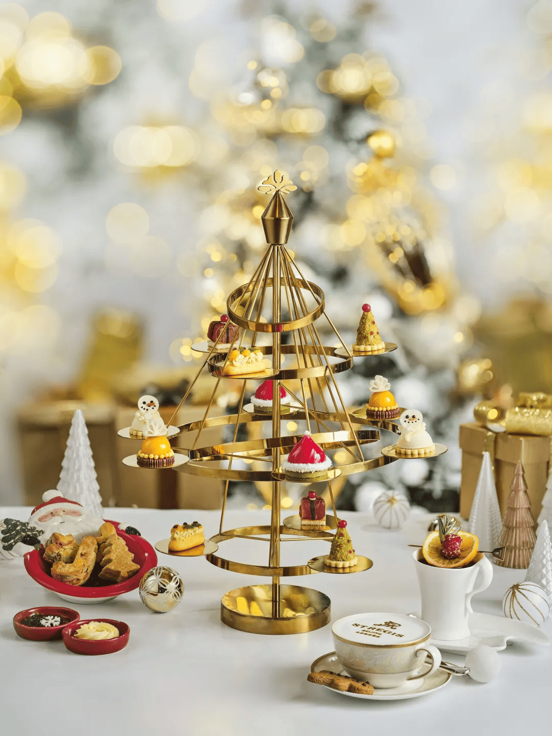 步入酒店大堂,宛若踏入一个温暖而华丽的金色梦境。与整体节日陈设的色调一脉相承,今年节日下午茶的呈现,被匠心独具地设计成一棵璀璨夺目的金色节日树。其灵动的枝桠线条以现代笔触勾勒,层叠的架构错落有致,将传统节日符号与摩登美学巧妙结合。每一份精致的甜咸点被悉心放置于“树梢”,在柔和灯光的映照下,流转着熠熠生辉的光泽,与周遭环绕的节日装饰共同谱写出一曲和谐而华美的视觉交响乐。