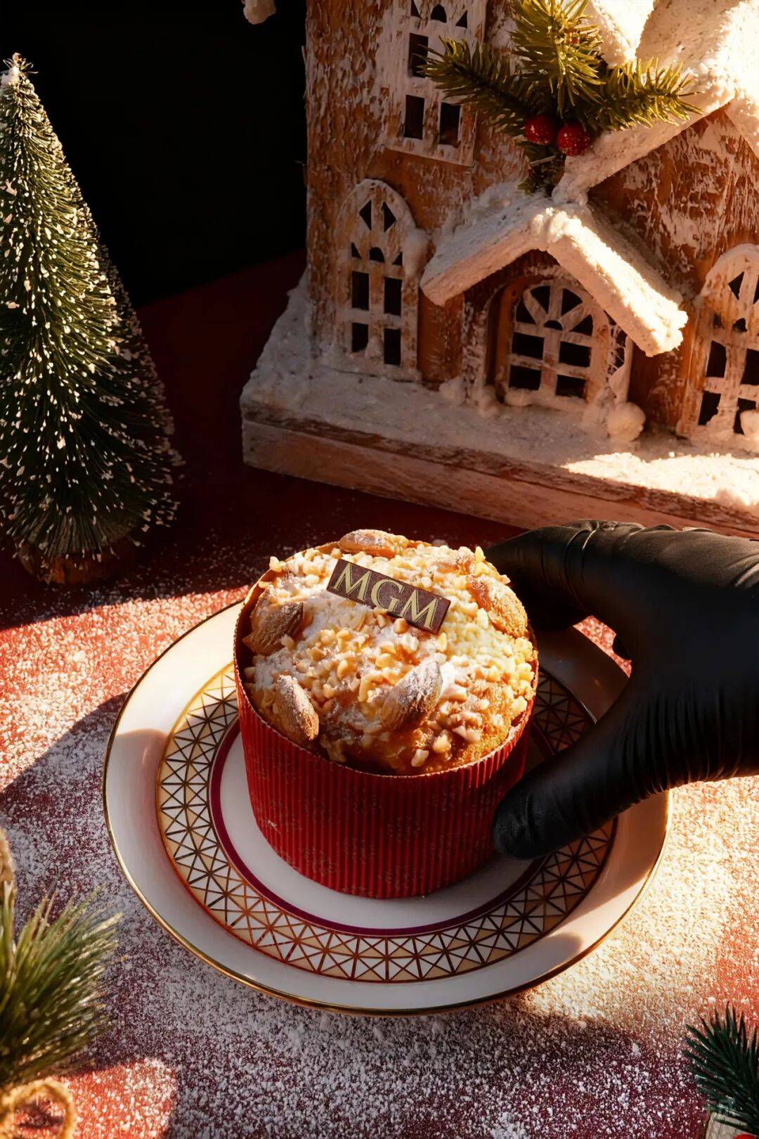 下午茶甜品匠心融入节日的仪式感,意式经典潘娜托尼面包,搭配香草奶油与草莓酱,口感松软,果香洋溢;