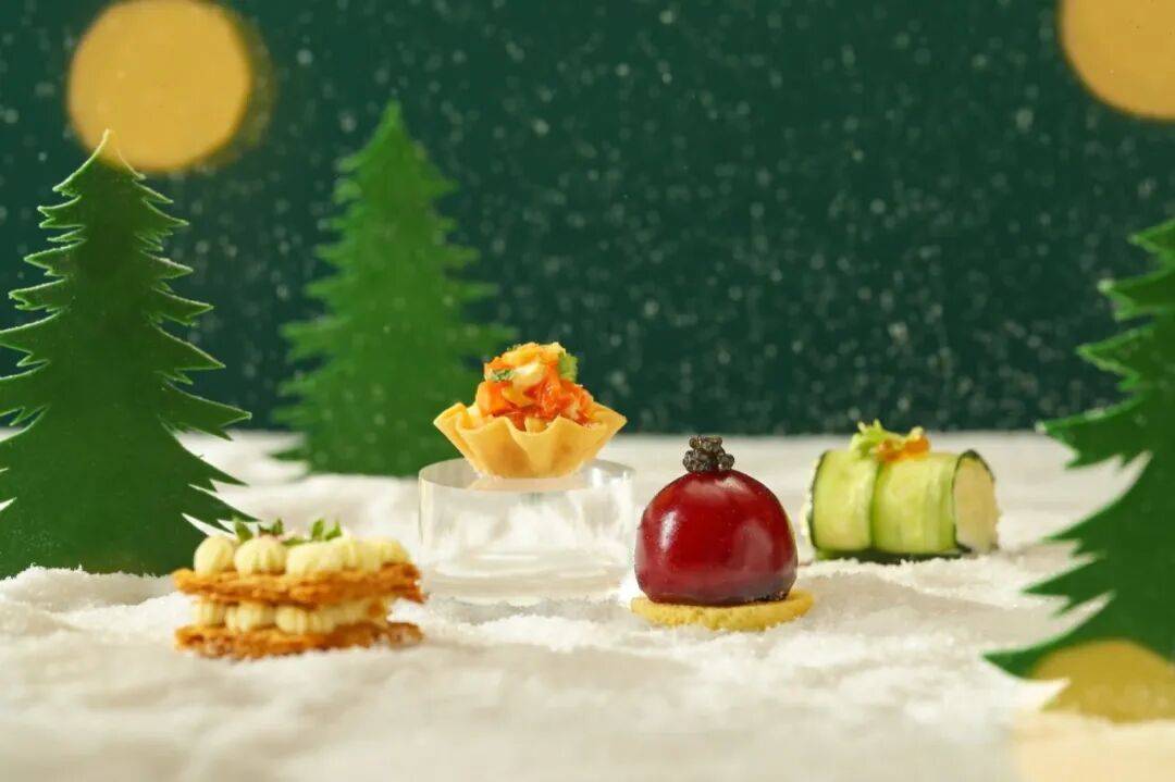 咸点展现主厨的创意,金枪鱼、罗勒和蛋黄酱做成的“圣诞树”;帕尔马火腿包裹的“圣诞礼物”在食材的碰撞中唤醒味蕾;而闪电泡芙则于经典风味中融入节日的欢愉。