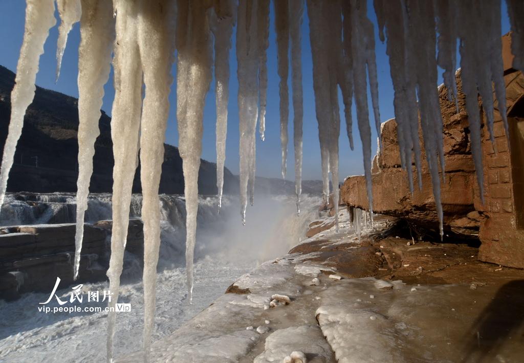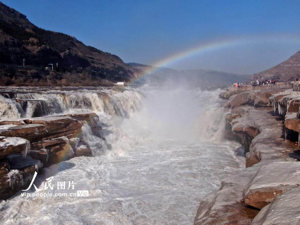 近日,受持续降温天气影响,位于晋陕交界的黄河壶口瀑布出现了冰挂与流凌景观。滚滚黄河水裹挟着大大小小的冰凌顺流而下,与瀑布两岸的冰挂和彩虹,共同组成一幅动静分明的壮美画卷。吕桂明摄(人民图片网)