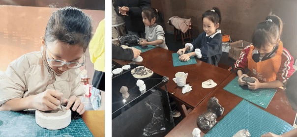 手作体验,塑造美好:孩子们先触摸分辨瓷泥与陶泥,感受质地特性,再选择中国风模具,体验脱模、塑形、修整等工序,亲手制作专属陶艺摆件,化身小小艺术家。