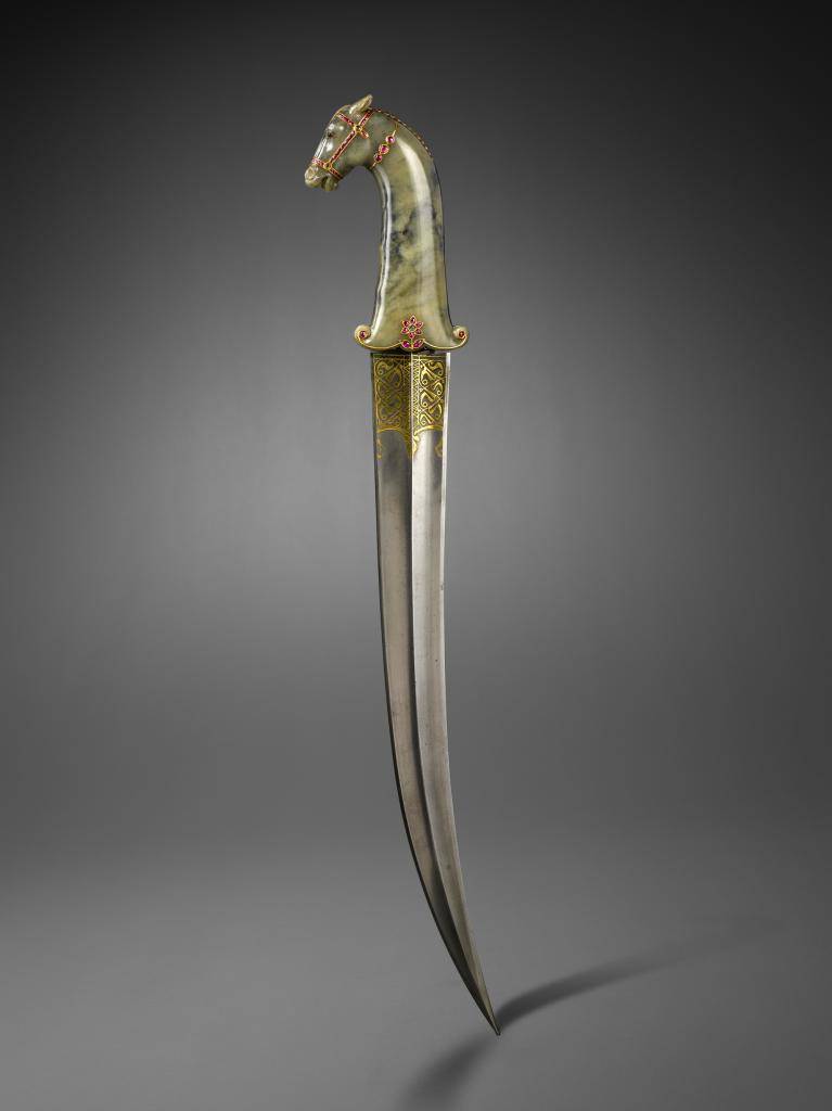 同样引人注目的是一把17世纪印度的带马首柄玉鞘匕首。其手柄由玉石雕成,镶嵌红宝石、祖母绿与黄金,极尽奢华,暗示它可能用于重要赏赐或外交赠礼。雕刻者对马首的刻画达到了惊人的写实高度——微张的口中可见舌齿,鼻翼仿佛因呼吸而轻微颤动,反映了莫卧儿艺术对自然主义的浓厚兴趣。“然而,”努贾伊姆特别指出,“与中国文化中‘马’所蕴含的龙马精神、成功晋升等深厚象征不同,在这件器物上,马的形象更侧重于纯粹展现拥有者的高贵身份与财富,是一种写实主义的彰显。”