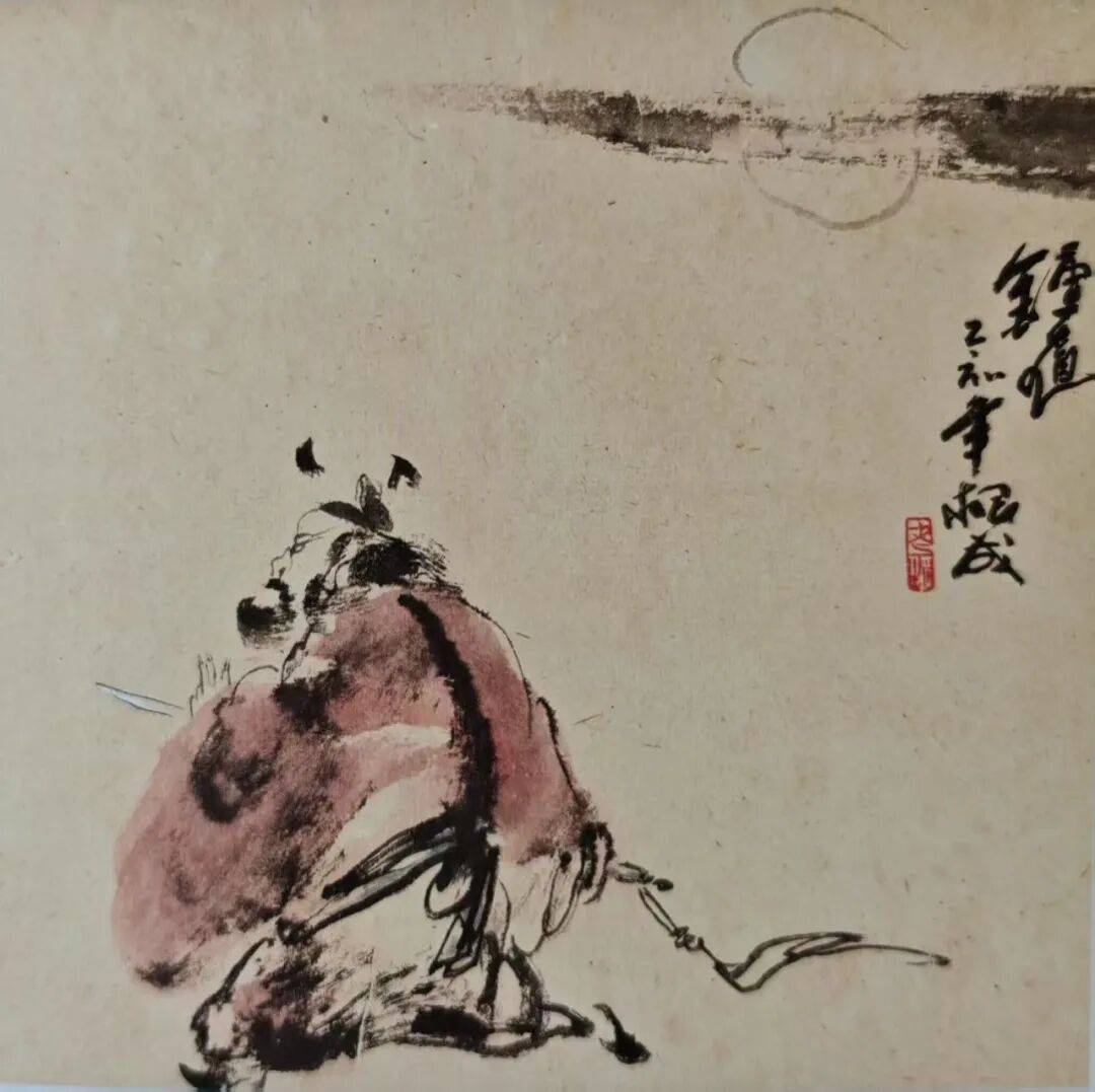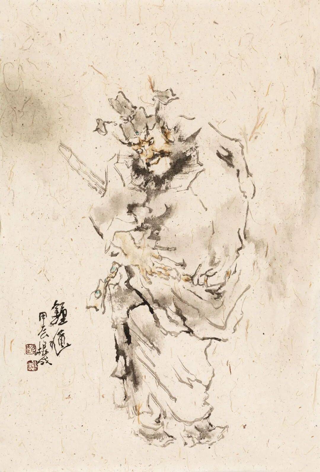 根成之人物画,势欲飞动,以行显心。他的笔法简洁,力拔千钧,恣意纵横,吞吐山河。《钟馗读书图》,《钟馗夜巡图》,这些被前人画千百遭的传统题材在赵先生笔下可谓别开新面,他笔下的钟馗,既继承前人“#须云鬓,数尺飞动,毛根出肉,力健有余”的传统,又不限于传统,大胆创新。钟馗读书,毛发竖立,目光如点;似乎读书亦不忘捉鬼;钟馗夜巡,全神贯注,机警而不小心,唯恐惊动了正躲藏在阴暗的角落里干坏事的鬼,不能将其一网打尽,寥寥数笔,将钟馗之神表现得淋漓尽致。如果说,他画钟馗是以动显静的话,而《静心图》中可见思想者的一面,以静显动,即显内心之活动。