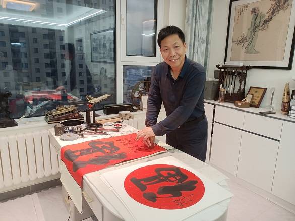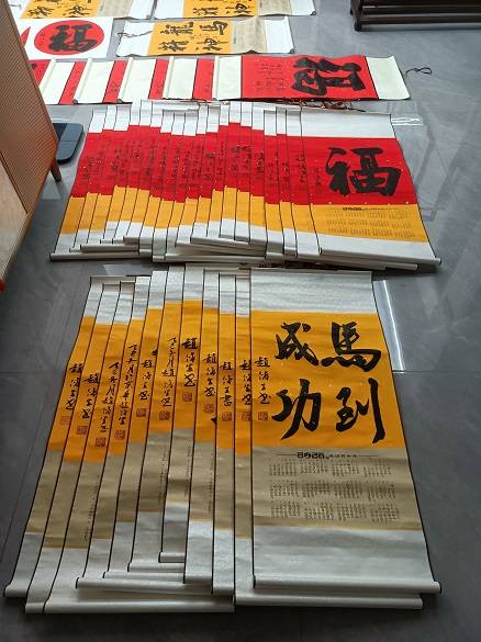 现场创作的部分2026马年书法挂历作品和“福”字书法作品