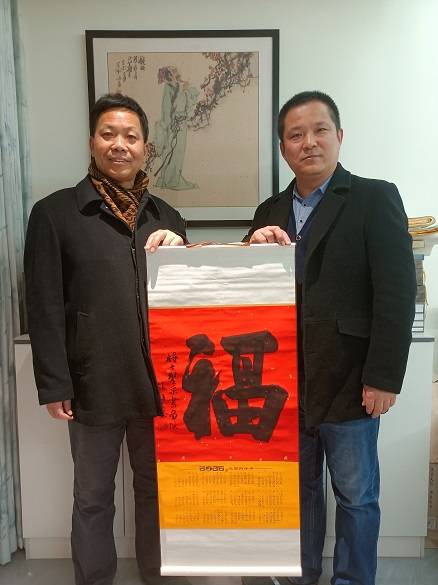 赵俊生(左)与李明(右)在其书写的2026马年书法挂历前合影