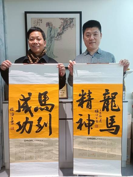 赵俊生(左)与王景轩(右)在其书写的2026马年书法挂历前合影