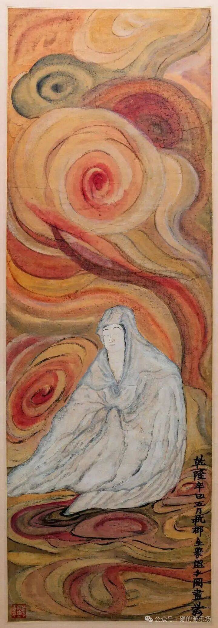 “扬州八怪” 之一金农的 74 岁作品《观音图轴》。画作用色艳丽,背景色调竟让人联想到蒙克的《呐喊》,但画中白衣观音低眉闭目、神情安详,与《呐喊》的恐慌感形成鲜明对比。金农独特的书法风格,更增添了这幅画的个人特色。