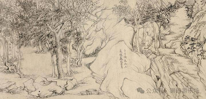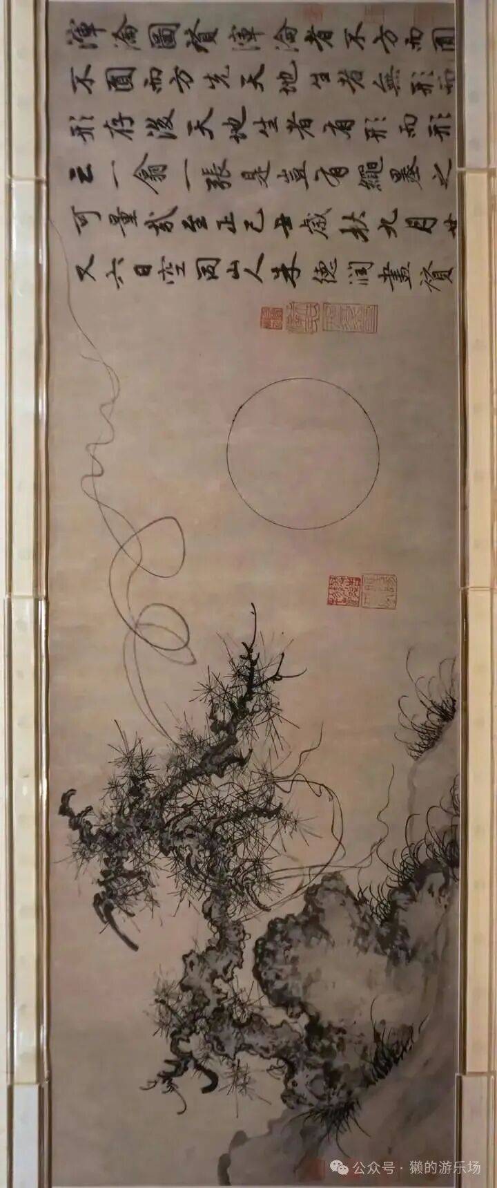 朱德润,元代著名画家、诗人。朱德润传世画作极少。此画的奇特之处在于,画面右侧绘有一个孤立而意义玄奥的圆圈,画面右侧一个孤立的玄奥圆圈,中间辅以几条曲线,画家在题跋中以 “不方而圆,不圆而方” 阐释,将道家 “道” 的宇宙本源思想融入画作,超越了传统山水画的范畴。