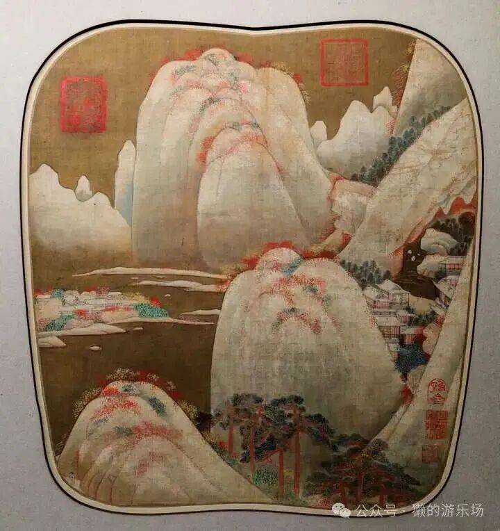 在上博至扇至美特展上第一次见到此画,印象深刻。这是元代少有的保存完好的没骨法雪景扇面。画家以没骨技法绘雪后山景,楼宇隐现于银装素裹的群峰间,红树绿叶在白雪映衬下格外明丽。