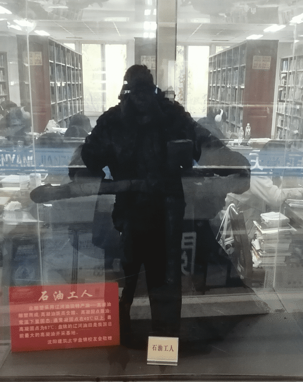 一位身着棉袄、头戴棉帽的钻井工人手持大钳,用力拧紧钻杆,紧锁的双眉和脸上的青筋尽显钻井工人的坚毅。整个作品展现出了石油工人的风范和铁人精神。此雕塑采用辽河油田特产油——高凝油雕塑而成,高凝油既高含腊、高凝固点原油;常温下呈固态;通常凝固点在40.C以上,最高凝固点为67.C;盘锦的辽河油田是我国目前最大的高凝油开采基地。可想而知,从地下开采出的又黑又亮、热气腾腾的高凝油,到了地面很快就变成了坚硬的固体,但竟然有人把它制成雕塑等工艺品,这就是高凝油雕塑的由来。该件艺术品由盘锦校友会赠送。