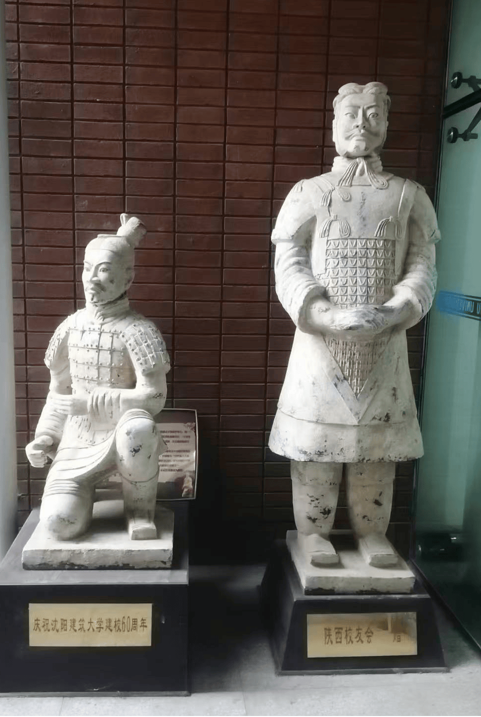 兵马俑,即秦始皇兵马俑,第一批全国重点文物保护单位,第一批中国世界遗产,位于今陕西省西安市临潼区秦始皇陵以东1.5千米处的兵马俑坑内。兵马俑是古代墓葬雕塑的一个类别。兵马俑即制成兵马(战车、战马、士兵)形状的殉葬品。1974年3月,兵马俑被发现。1987年,秦始皇陵及兵马俑坑被联合国教科文组织批准列入《世界遗产名录》。并被誉为“世界第八大奇迹”,先后有200多位外国元首和政府首脑参观访问,成为中国古代辉煌文明的一张金字名片。被誉为世界十大古墓稀世珍宝之一。沈阳建筑大学陕西校友会为学校六十年校庆捐赠品为跪射俑(左)和军吏俑(右)两尊兵马俑模型,主要是因为:一是特色,二是忠诚,三是拼搏,四是眷恋,五是祝福,六是期望,深刻简单朴实真挚的表达陕西校友对母校的拳拳之心。