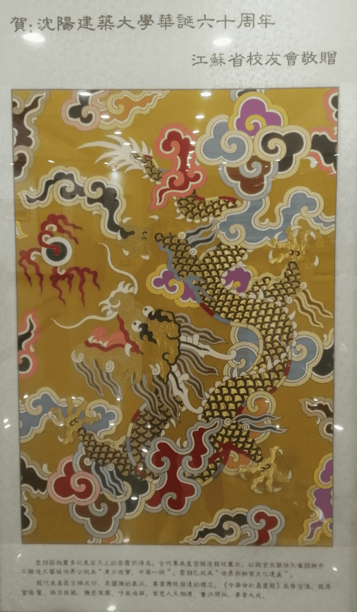 研祥图书馆里的这幅用料考究、织造精细,图案精美、锦纹绚丽、色泽灿烂的苏绣云锦上绣着一条喜气吉祥、极目远眺的巨龙盘桓于云霞之上。这幅云锦是由江苏校友会在学校六十年校庆时赠送给学校的,现藏于图书馆一楼中庭,寓意是人天相通,努力开拓、事业大成、兴旺发达,表达了江苏校友对母校的美好祝福。云锦是我国传统的丝制工艺品,有“寸锦寸金”之说,其历史可追溯至公元417年的东晋时期,距今已有1600多年的历史。到了清代,云锦织造工艺达到了巅峰,鼎盛时,南京拥有3万多台织机,有近30万人以此或以与此相关的产业为生,云锦织造是当时南京最大的手工产业。如今,云锦依然保持着传统的特色和独特的技艺,保留着传统的工艺织造。据说,这种靠人工记忆编织产品的织造技艺,达到了丝织技艺的巅峰,目前尚无法用机器来替代,被誉为“锦中之冠”。云锦代表了我国丝织工艺的最高成就,浓缩了我国丝织技艺的精华,是我国丝绸文化的璀璨结晶。