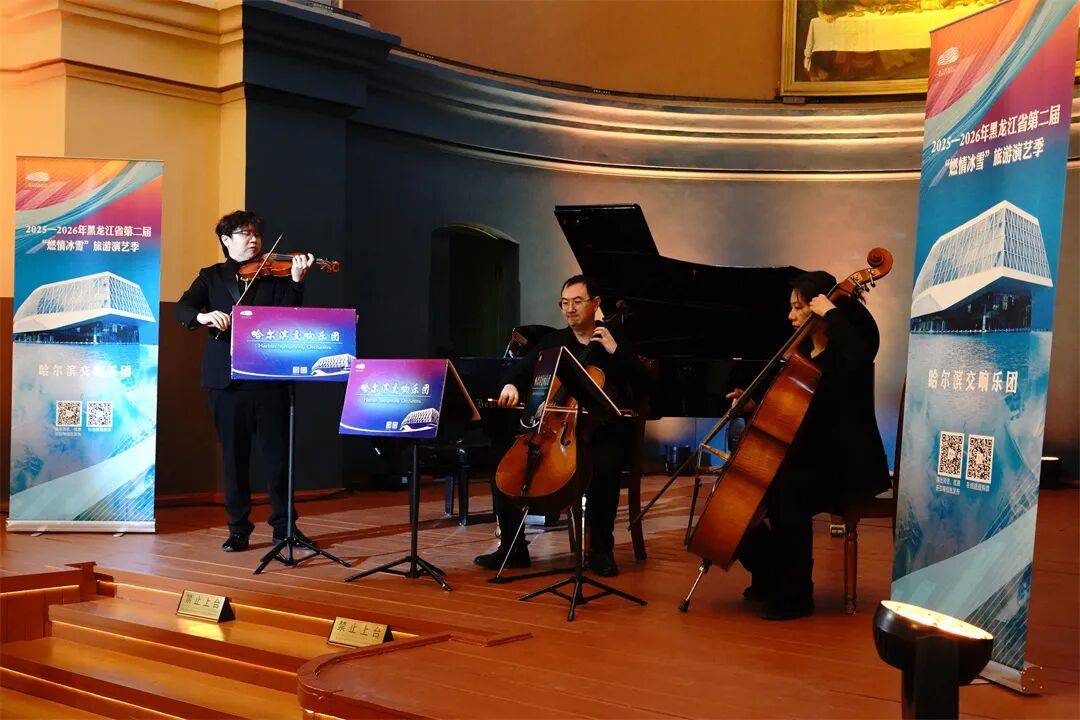 12月10日,哈尔滨交响乐团莫逆四重奏、音客室内乐团亮相焕新开放的索菲亚景区,用多首经典曲目献上两场沉浸式音乐盛宴。作为文旅融合的创新实践,哈尔滨交响乐团“进景区进商圈”活动为2025—2026年黑龙江省第二届“燃情冰雪”旅游演艺季再添重磅惊喜。