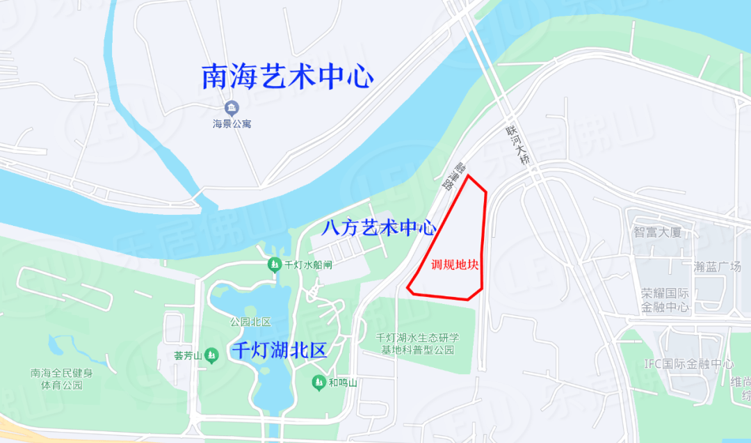 从位置来看,地块地处千灯湖公园北区,被三条道路包围,北侧临佛山水道,西侧是八方艺术中心、南侧是千灯湖水生态研学基地,东南侧是宏宇珑裕中心。