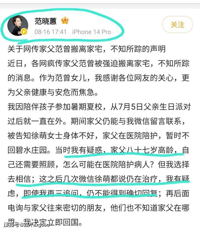 本来一家人和和气气,但今年8月,范曾女儿范晓蕙就曾公开发文,称父亲被妻子徐萌带离住所后“失联”
