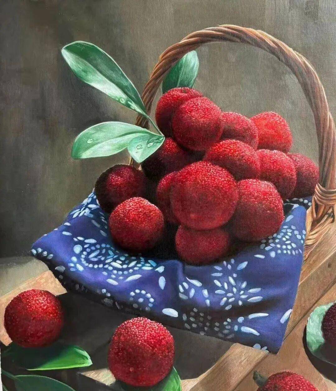 写实油画绘画表现手法杨梅,多层次技法体系,分层罩染,注重造型准确,色调真实,细节刻画和画面的通透感,明暗关系的掌控,这幅杨梅画面才具有呼吸感,不会显得沉闷。
