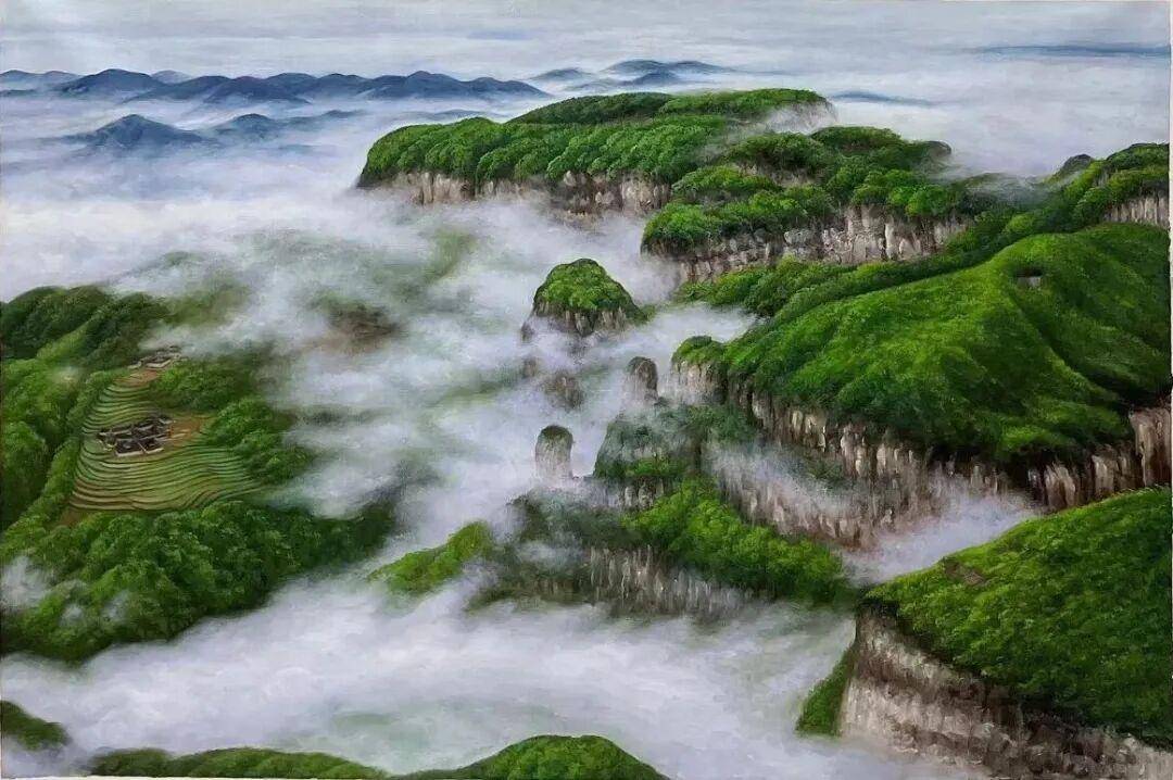以写实画法表现,崖壁突兀孤立在山坡上,深沉且厚重。变化多端。云雾缭绕,整片山谷在山脚下,铺展成翡翠色涟漪。