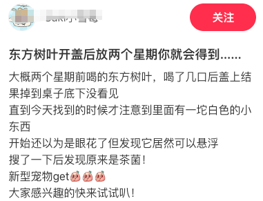 其次,社交媒体上的猎奇分享推动了这一现象的传播。年轻人在社交平台上展示自己培育的“茶菌”,分享观察记录,形成了一种小众圈子的互动方式。