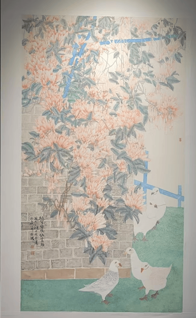 琚凤花 檐下花鸣·鸽踏春阳 178×96cm 纸本设色2023年