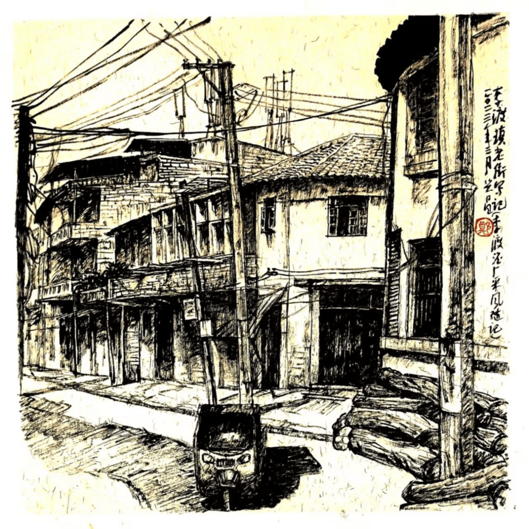 郑兴昌 李渡镇老街写记 40×40cm 卡纸焦墨画 2023年