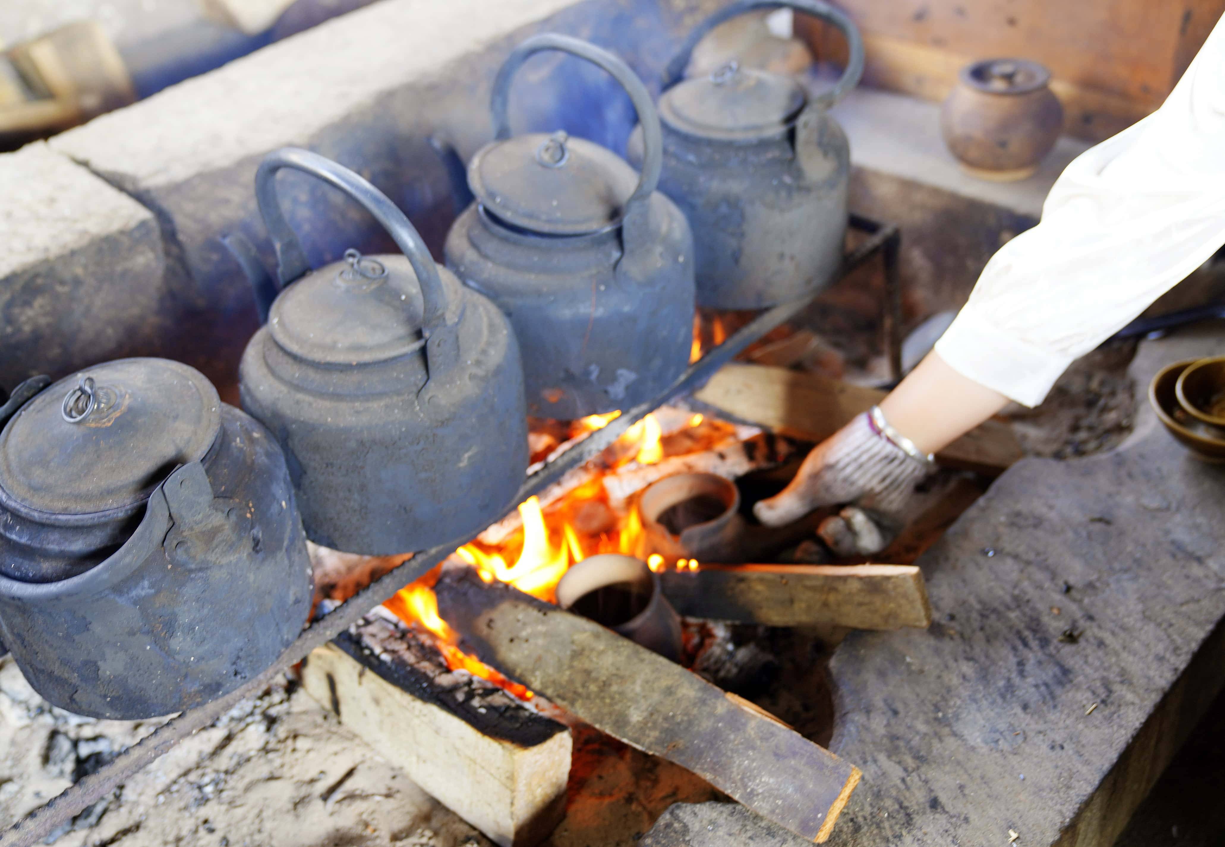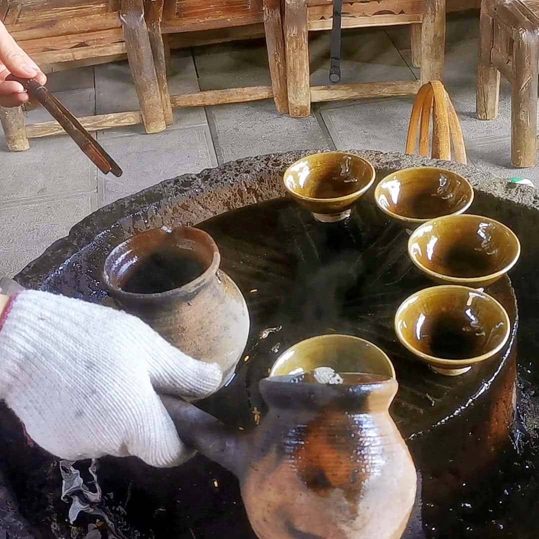 院落里的炭火正旺,制茶师傅已经开始了雷响茶的现场演示。整个过程分为烤茶、冲泡、分茶三步,每一步都藏着古法的智慧。师傅先将装有茶叶和糯米的两个小瓦罐,分别架在炭火上慢慢烘烤,茶叶的焦香与糯米的甜香逐渐弥漫开来。待烤至茶叶微焦、糯米金黄,师傅提起烧开的铁壶,将沸水倒入装茶的瓦罐中——“轰隆”一声巨响,瓦罐内沸水翻腾,水汽喷涌,真如惊雷乍现。紧接着,再将茶水倒入烤糯米的瓦罐,又是一阵雷鸣般的声响,沸水裹挟着茶与糯米的香气,在院落中久久不散。