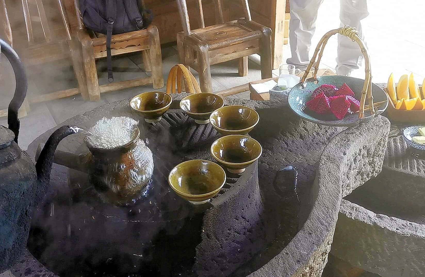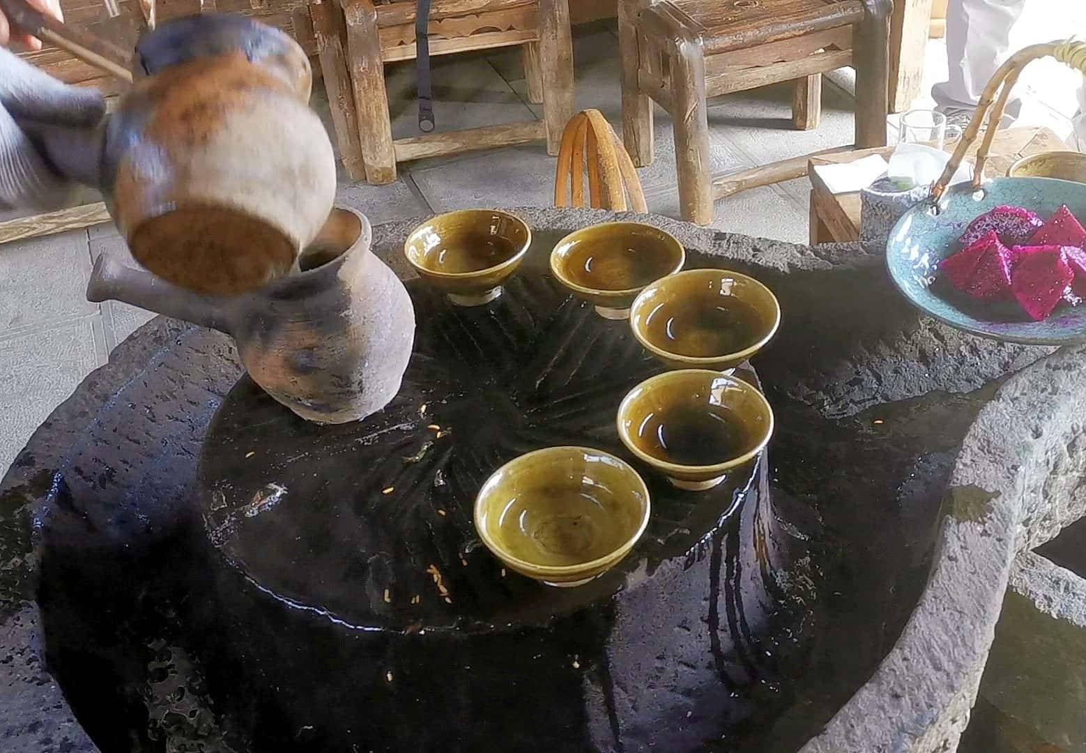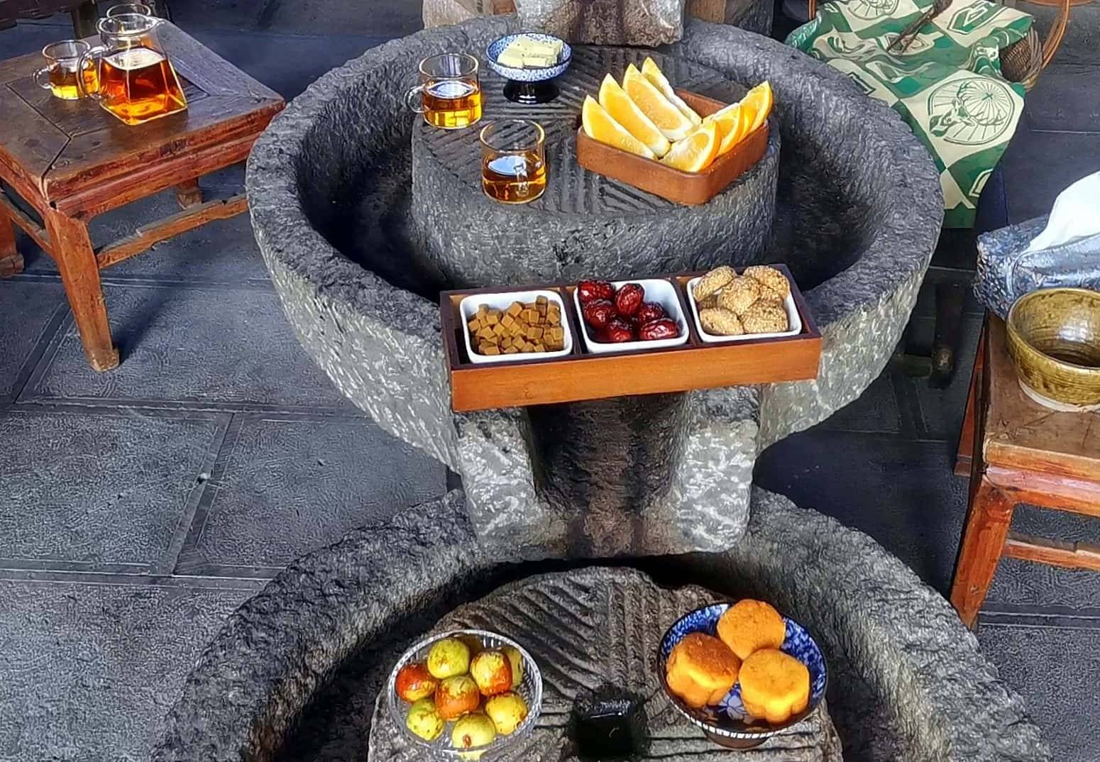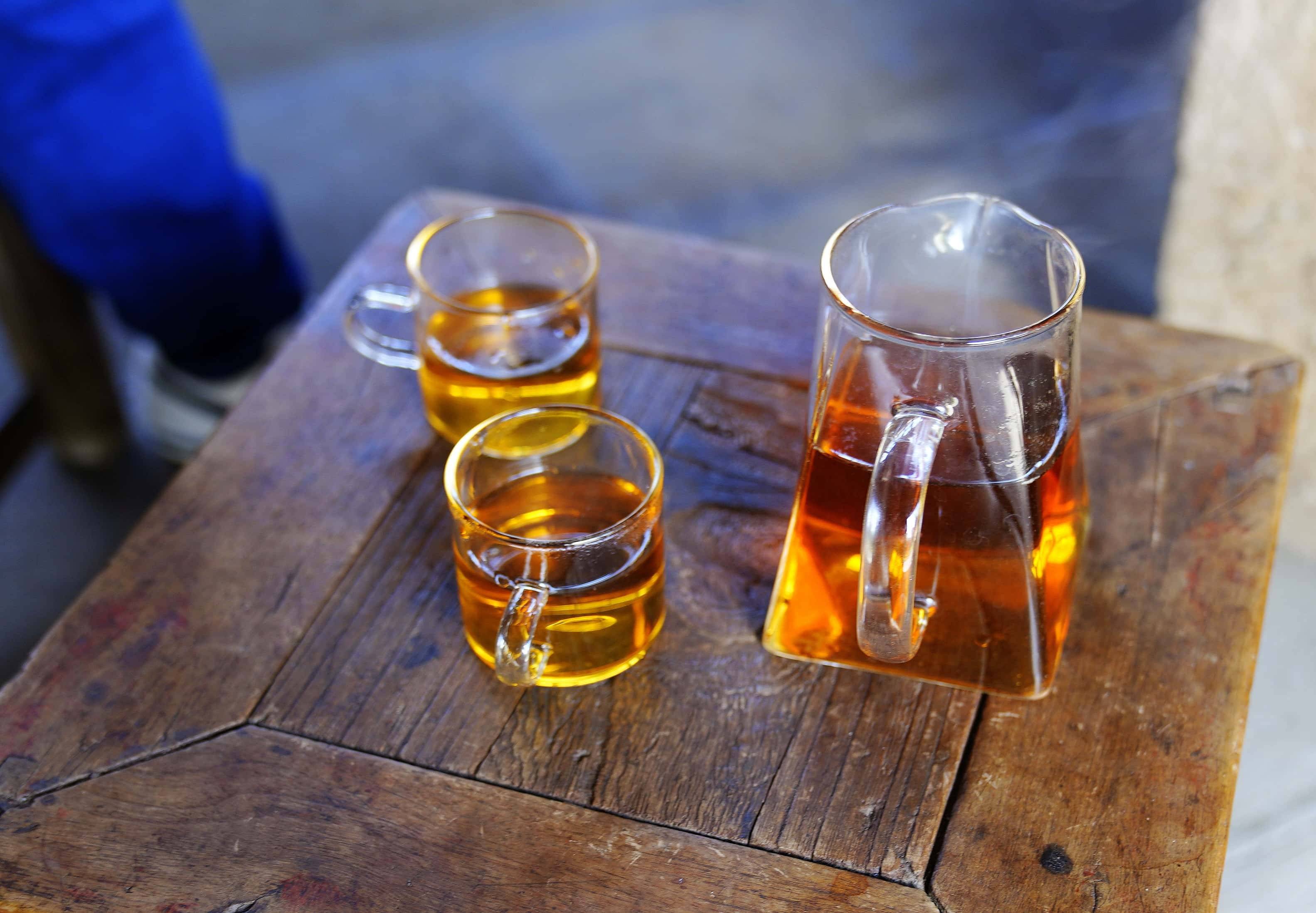 稍作静置,师傅将混合了茶与糯米的茶汤倒入茶碗,茶汤红如玛瑙,光泽诱人。端起茶碗轻抿一口,初尝略带苦涩,细细回味却甘醇生津,焦香的糯米味在口腔中缓缓回旋,与茶香交织成独特的风味。就着店家备好的茶点,我们慢慢品味这杯来自马帮时代的茶饮,耳畔仿佛响起了茶马古道上的马蹄声与铃铛声,眼前浮现出马帮汉子迎风前行的身影。