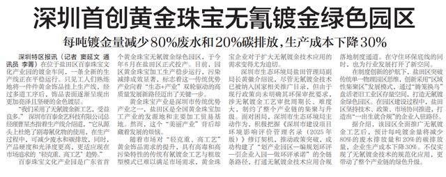 深圳市生态环境局盐田管理局副局长黄徽介绍说,尽管无氰镀金技术已被纳入国家相关推广目录,但由于现行政策尚未明确其环保审批要求,涉无氰镀金工艺审批周期长、难度大,制约了整个产业链的集聚与升级。面对困局,深圳市生态环境局主动作为,积极把握《深圳市建设项目环境影响评价管理名录(2025年版)》修订契机,推动政策突破,成功构建了“划产业园区—编规划环评—引企业入园—做环评承诺”的全链条路径,打通无氰镀金技术应用合规落地制度通道。在守住环保底线的同时,也为行业发展打开了新空间。