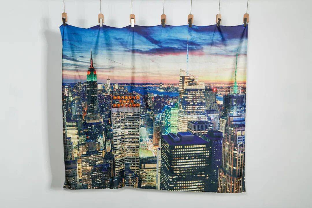 购得纽约曼哈顿夜景装饰布,将“我离开黑桥可能不快乐但徐渠可以去纽约”字样模拟灯箱缝制于曼哈顿夜色中。
