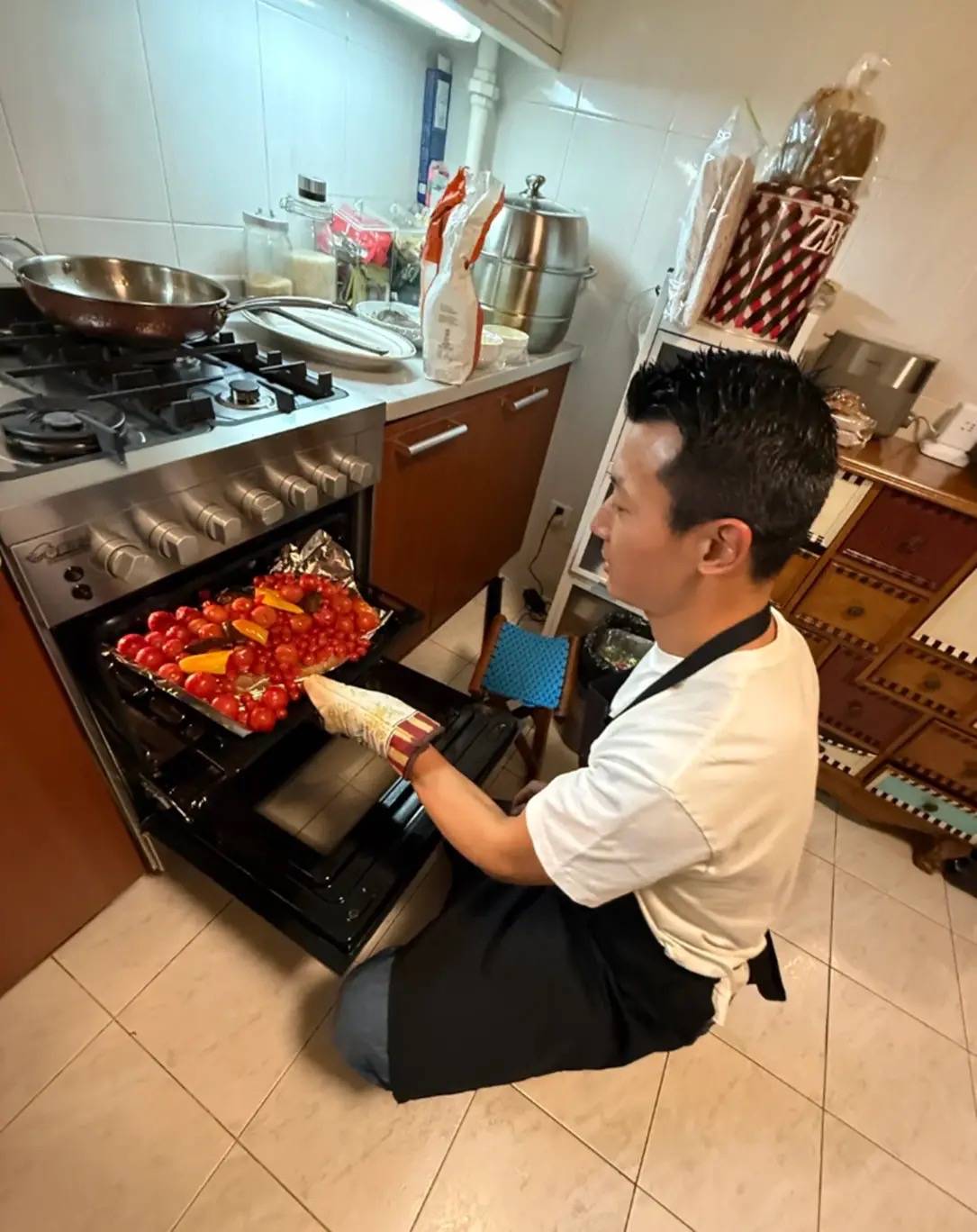 几乎每次朋友来家里聚餐,都是王昀佳掌勺。他们的家里很暖和,应该是开了地暖。王昀佳只穿了一件白色短袖,戴着围裙忙前忙后的模样太有魅力了。