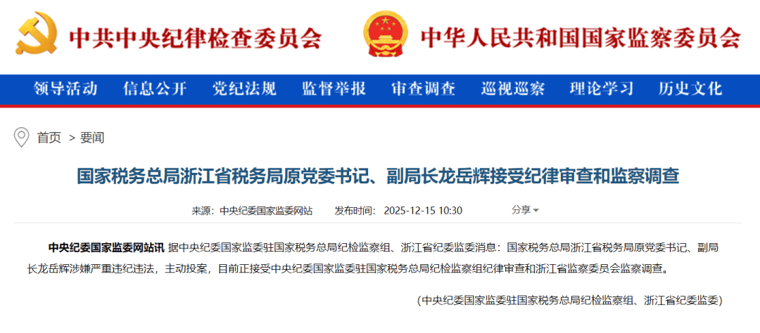 据中央纪委国家监委驻国家税务总局纪检监察组、浙江省纪委监委消息:国家税务总局浙江省税务局原党委书记、副局长龙岳辉涉嫌严重违纪违法,主动投案,目前正接受中央纪委国家监委驻国家税务总局纪检监察组纪律审查和浙江省监察委员会监察调查。