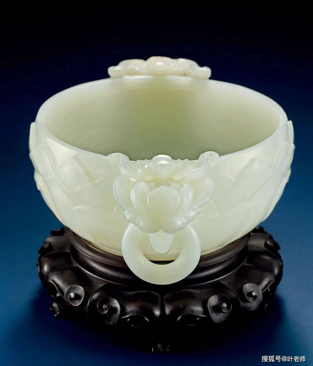 此洗白玉质,温润如脂,腹外浅浮雕莲瓣纹饱满丰盈,洗两侧圆雕双莲花形耳,蝙蝠伏于耳上,耳下琢活环,洗内浅浮雕有水仙、灵芝图纹,底部阴刻几何地花卉纹。莲花具出泥不染之习性,寓意廉洁。