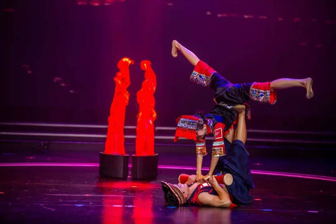 ——2025年,“新湘潮•当然湖南”2025年“欢乐潇湘”群众文化活动展演“郴心郴艺•群星有我”郴州专场,桂阳县文化馆代表队表演了双人舞“夜话瑶山”。剧照画面中,男女舞者正以力量与柔美交织的姿态展现瑶族风情,女舞者以倒立等高难度技巧舒展身姿,男舞者以支撑、托举等动作传递力量,肢体线条流畅且充满张力,尽显瑶族舞蹈的粗犷与灵动;服饰色彩鲜艳、纹样富有民族特色,既保留瑶族传统元素,又通过现代设计适配舞台呈现;舞台灯光聚焦舞者,背景红色装置(如火焰造型)营造热烈氛围,强化“夜话”主题的神秘与浪漫,让观众直观感受到瑶族文化的独特魅力与舞蹈表演的视觉冲击力。