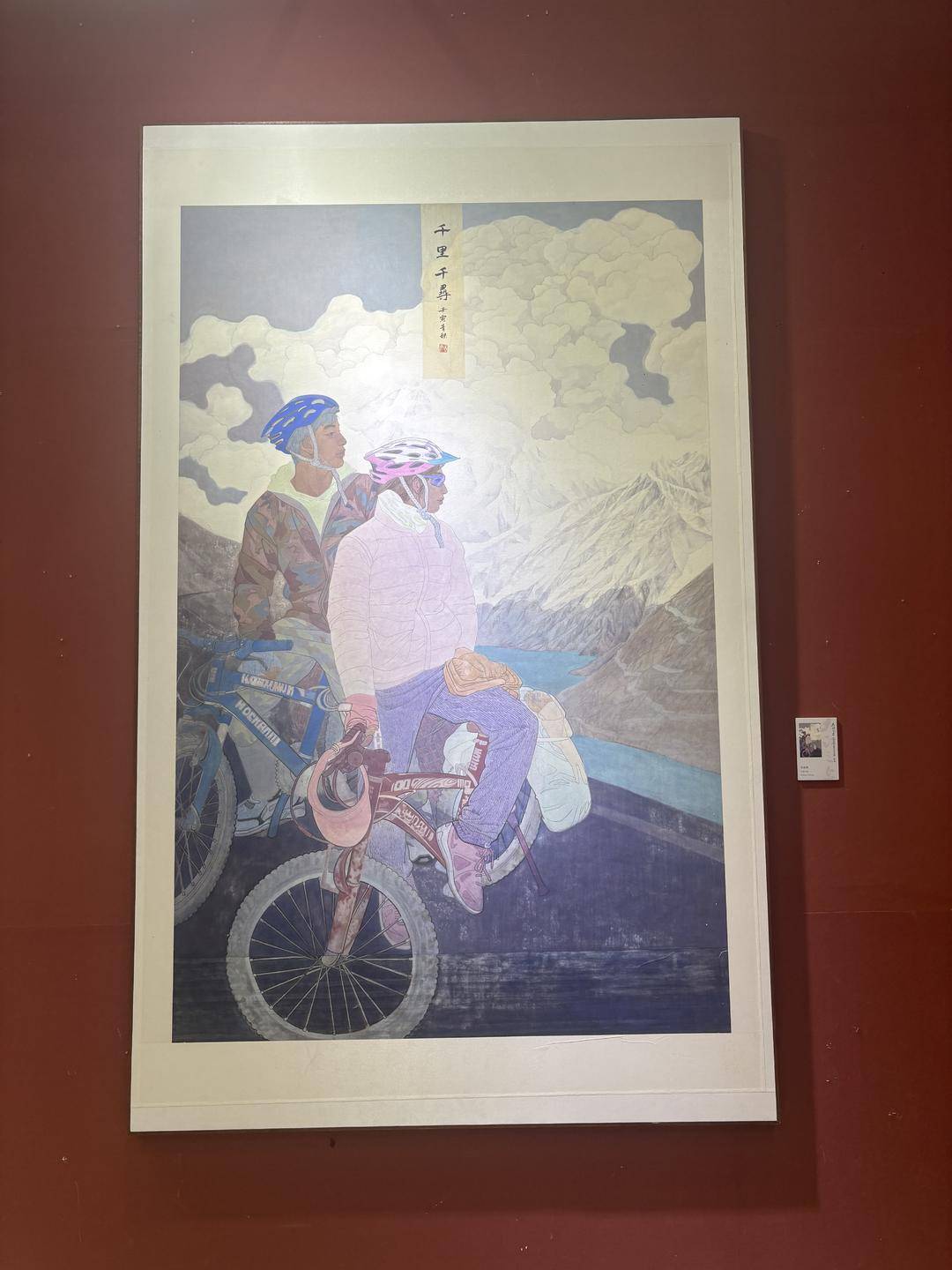 记者在现场发现了不少名家作品。比如李青稞的《千里千寻》,描绘的是两位骑行者回望长江的身影,意境悠远;周明安的《佛佑三江》将乐山大佛的庄严与三江汇流的浩荡融为一体,充满人文底蕴;龚仁军的《塘边人家》则捕捉长江沿岸朴素的生活场景,烟火气息扑面而来。马一平的油画《密宁湾》展示出江水蜿蜒的静谧一刻,庞茂琨的油画《涓涓细流》捕捉山崖飞瀑的灵动瞬间。陈志才的水墨作品《生态长江》,水中的游鱼仿佛可以直接触摸,呼应了生态保护的主题;姚叶红的《蜀道》与李晖的《江源叠翠》皆以传统山水笔意,再现蜀山层峦叠翠、江水穿行其间的壮美古意。