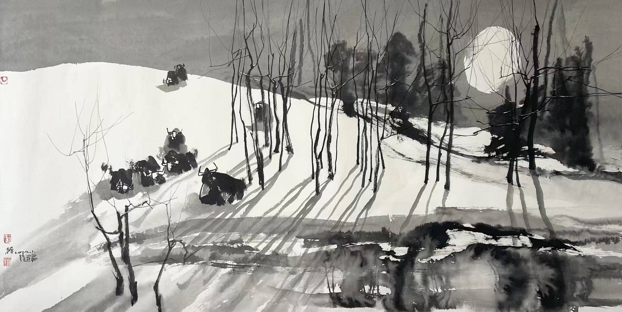 陆天宁长于江苏,故乡的四时风景对他来说有画不完的题材故事,冬日的江南风景和北方相比,少了一抹肃杀,多了一丝温情,黑白和光影有了另一种极致的诠释。正因为对故乡有深厚的情感,和采风相比,江南的风景是他的生活经历,这种注入成长和情感的风景在他笔下诗情画意,画出了东方水墨的内蕴和乾坤。
