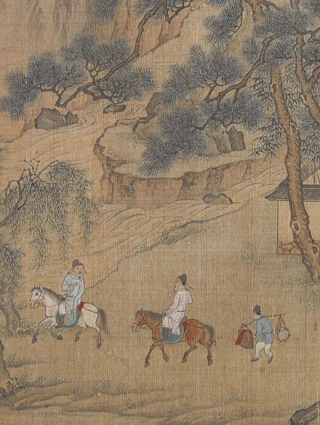 美国印第安纳波利斯艺术博物馆藏本(以下简称“美本”)为绢本设色,画面精工细腻,人物神态生动,笔墨勾勒一丝不苟,完全符合仇英一贯的工笔重彩风格。仇英以摹古精工闻名,却能于古意中注入新意,尤其擅长表现江南景致的灵秀与人物情态的传神。美本中,园内山庄门窗紧闭,陈设雅洁却空无一人,桥边两人一马携僮仆轻快而来,渡口春水初平,舟船往来穿梭,整个画面动静相生,春景诗意被诠释得淋漓尽致。这种细腻的笔触与连贯的气韵,正是仇英成熟期的典型特征。