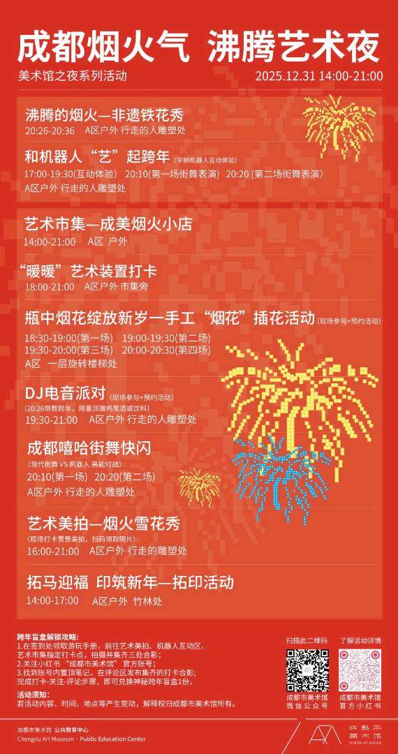 红星新闻网(记者 但唐文)12月24日报道2026 新年将至,一场融合非遗技艺、潮流艺术与科技互动的跨年盛宴即将在成都市美术馆开展。跨年“美术馆之夜” 将于12月31日正式上线,打造一场年轻的、无需熬夜、轻松跨年的跨年新体验!