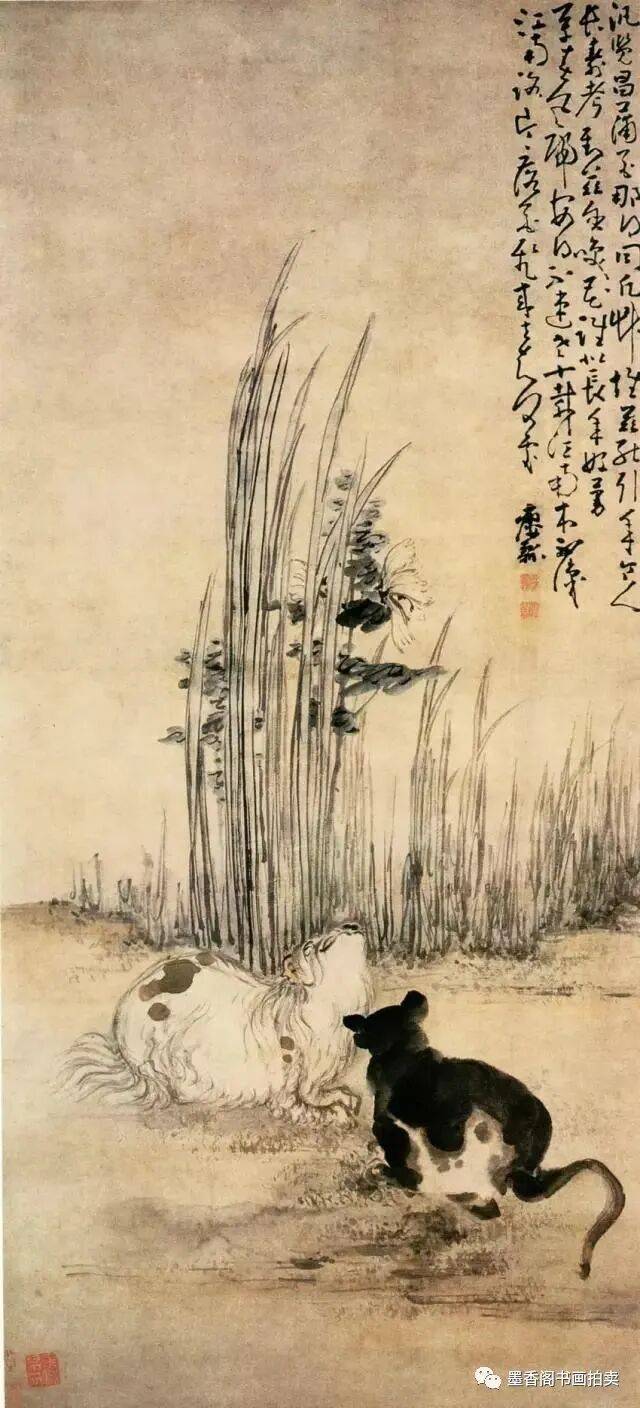 黄慎擅草书,书法学“二王”,更得怀素笔意,从章草脱化而出。其遒劲运笔亦用于绘画之中,故画面多干枯、飞白和迅疾之迹。