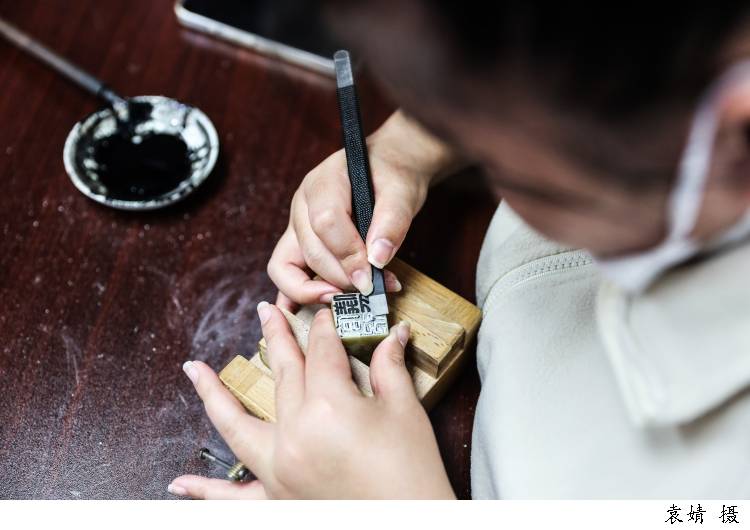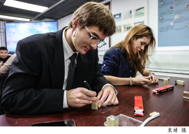 图为来自塔吉克斯坦的留学生李欣冉(中文名)在华东师大书法篆刻研究生同学的指导下体验篆刻艺术,亲手用刻刀将自己的中文名字刻成印章。