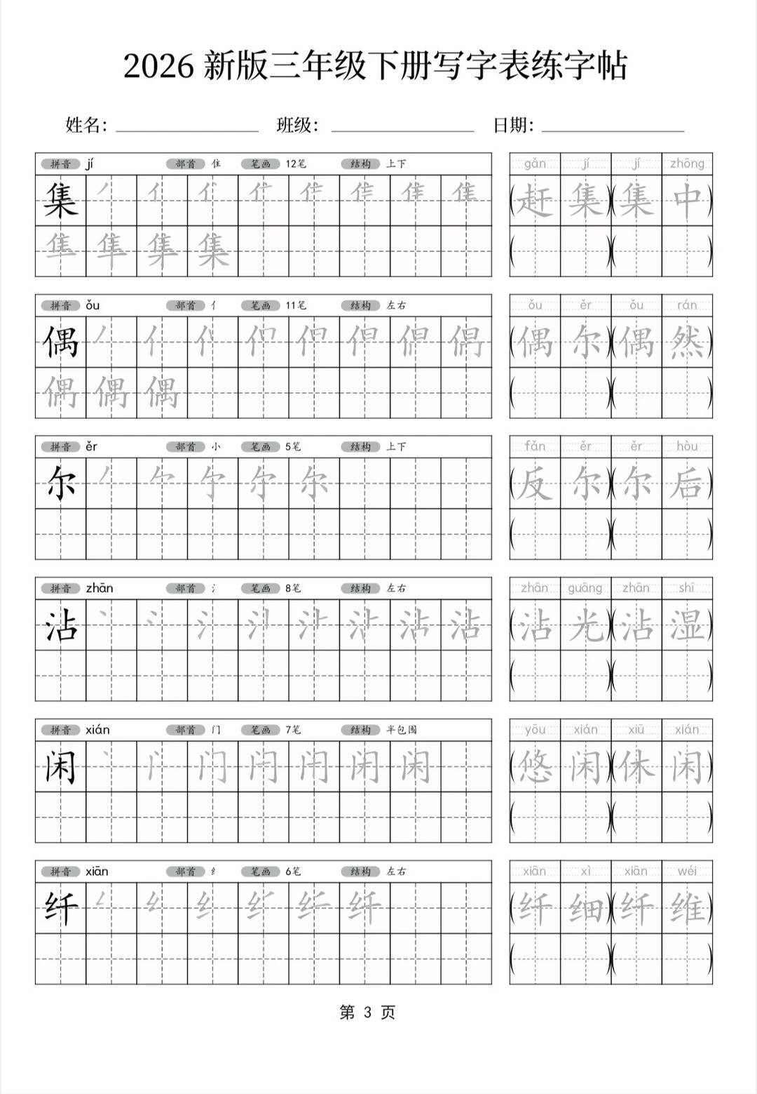 其次是设计踩中三年级 “目标明确 + 技能闭环” 的认知特点—— 三年级娃怕 “写字没重点、练了没提升”,这份字帖把学习做成 “精准闯关”:田字格框定书写比例,红笔笔顺抓核心笔画逻辑,组词练习对接课文语境,学习像 “跟着模板练出规范字 + 会用词”,完全不盲目;“基础信息→笔顺练习→组词应用” 的闭环模式,还能帮孩子快速建立 “字的结构→规范书写→语境运用” 的关联,效率直接拉满。