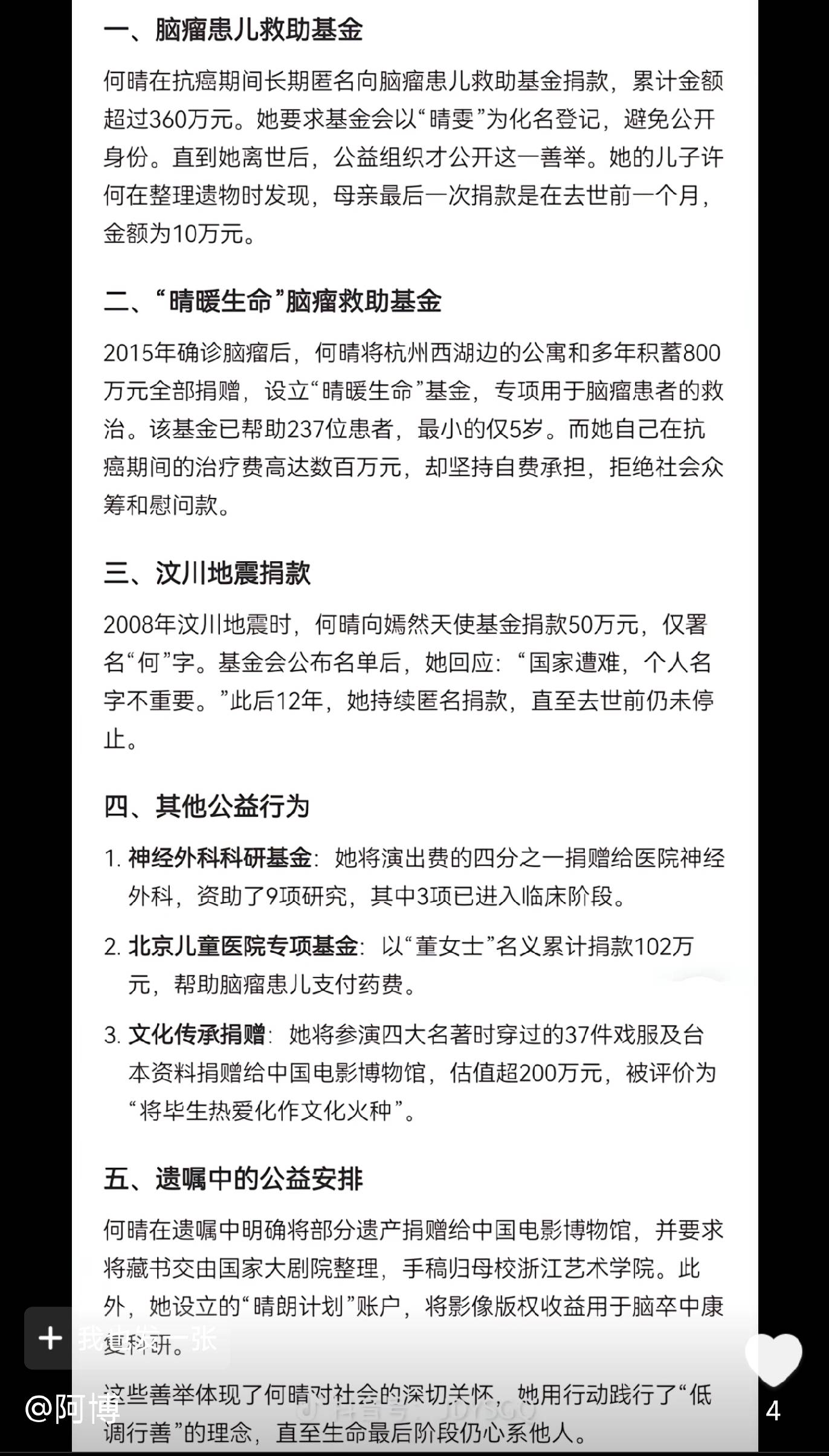 何晴离世13天以后,何晴生前曾帮助过的一位演员张大庆承诺将开始编撰何晴个人传记完成后出版 而且有网友曝出何晴生前曾多次捐款,而且大多数都是匿名或者化名