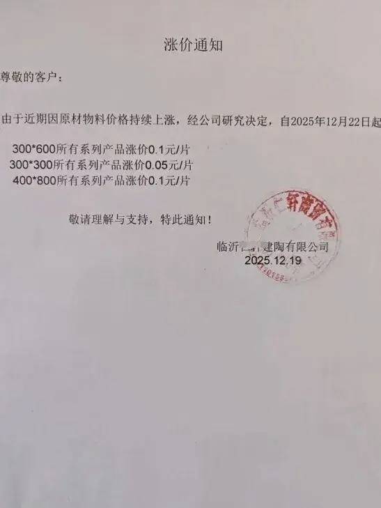 临近年关,陶瓷行业迎来一轮集中调价。近期,山东、河北、四川、广西、重庆等多个产区陆续有陶企发布涨价通知,瓷砖及西瓦产品均出现不同幅度上调。