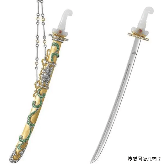 因此,辟邪小玉剑应运而生,它十分小巧,精致可爱,多以和田玉、翡翠等材质雕琢而成,常作为颈饰或包挂随身佩戴,这也是目前剑形珠宝市场上最常见的品类。