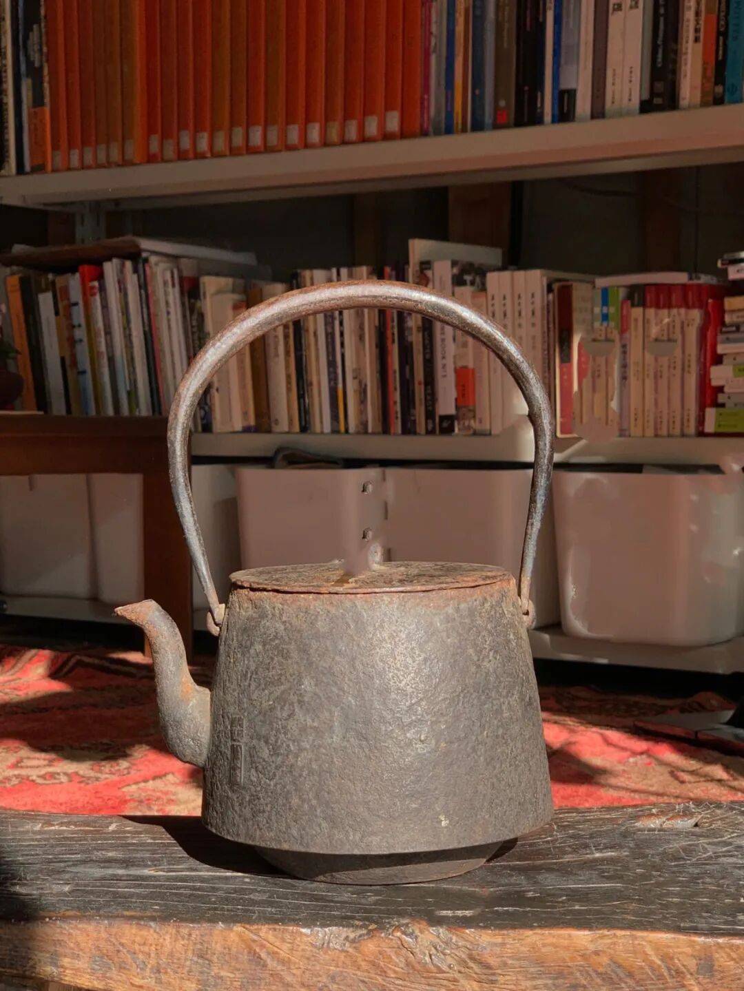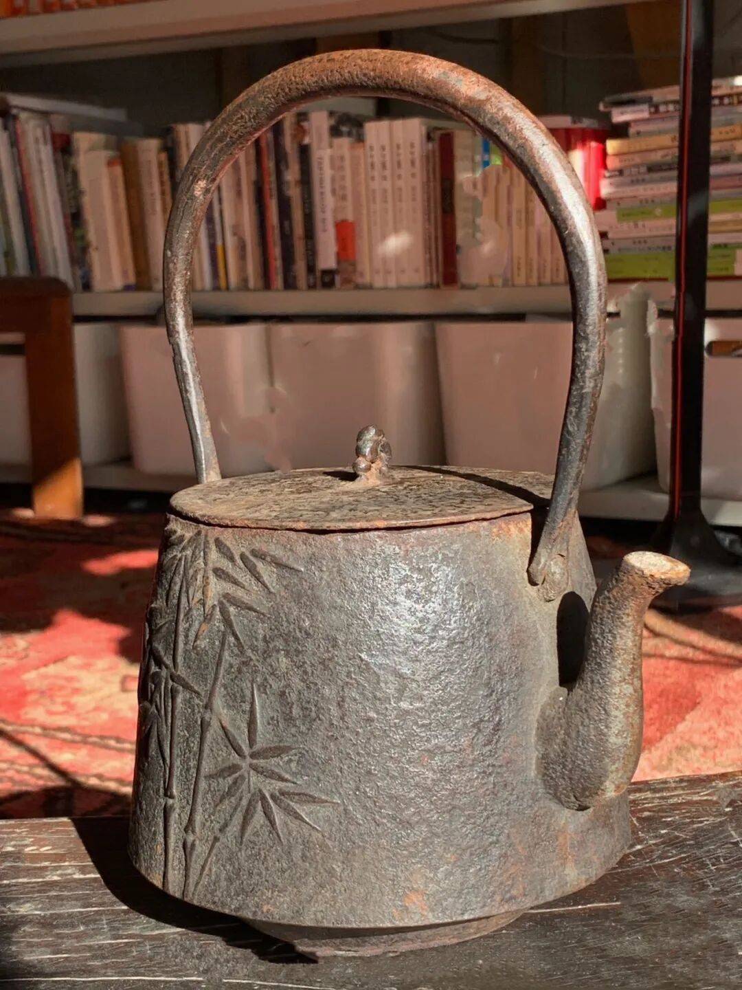 此雅竹纹茶道提梁烧水铁壶,其器型优雅,纹饰精美,因年代久远斑驳铁锈与深黑皮壳相间自然,壺盖曾断裂后已焊接修补,内部水垢层可以参考凊除攻略依个人喜好凊除,是可以当空间陈设的高雅器物,也是茶席烧水的实用茶道具。