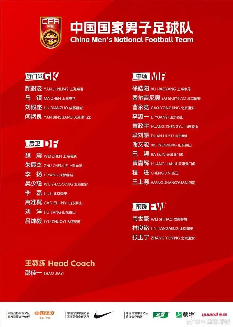 在邵佳一公布的26人名单中,老队长王大雷、中卫蒋光太、蒋圣龙落选,山东泰山后卫刘洋回归,正在备战U23亚洲杯的王钰栋、蒯纪闻等人无缘本次集训,天津津门虎门将闫炳良、成都蓉城后卫李扬、后卫吕焯毅3人首次入选国家队,北京国安中场塞尔吉尼奥是唯一入籍球员。山东泰山和北京国安是国脚输出大户,各有6名球员入选。