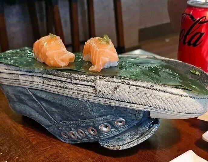 1、一双旧帆布鞋鞋底上,盛放的生鱼片