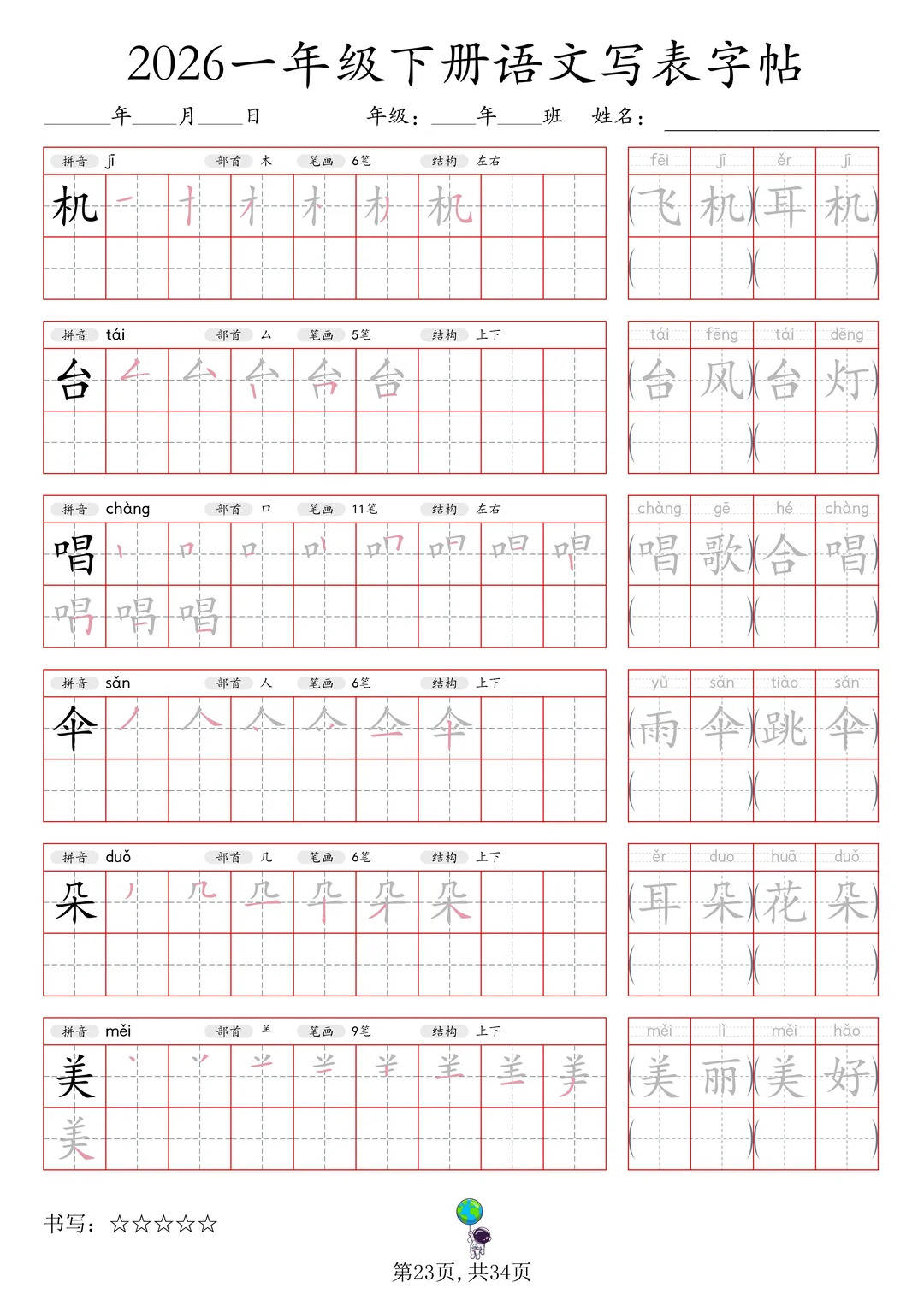 2026 一年级下册语文写表字帖直接把生字学习打包成 **“笔顺拆解 + 字理辅助 + 词语拓展” 的写字通关包 **:每个生字都标清拼音、部首、笔画,用红笔拆笔顺手把手教写,写完还能练 “飞机、台灯” 这类常用词语,写字像解锁 “汉字闯关任务”!