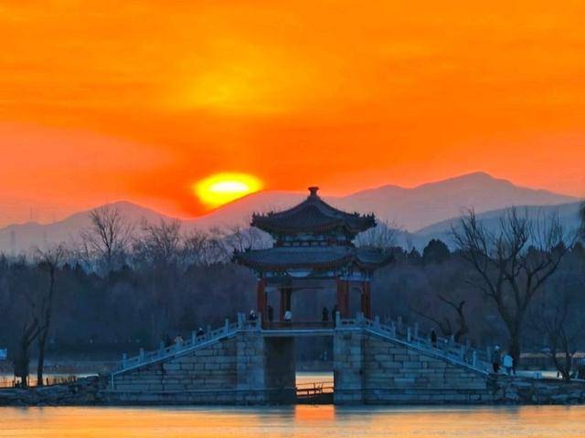 新年开工首日,在北京颐和园邂逅美丽的晚霞,暮色轻笼颐和园,昆明湖上晚霞似熔金倾泻,十七孔桥蜿蜒若金红飘带,与佛香阁共绘绮丽画卷。